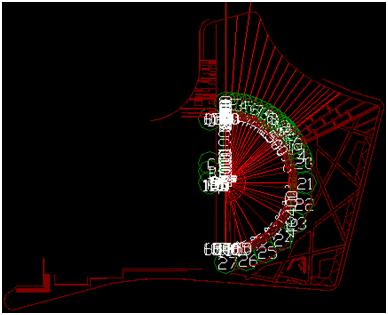 2、在建立軸網(wǎng)時,因景觀類工程一般沒有標準的縱橫軸線和軸線標識,所以需要充分利用已有的電子版CAD圖。在識別CAD圖時,可以把主要畫圖要用到的定位線作為軸線提取,如硬質(zhì)鋪裝和綠化邊線、人行道路沿線、林蔭步道的邊線、臺階邊線等;把其他需要輔助畫圖的線作為軸線標識提取,如綠化盲溝線、雨污水井邊線等??傊M可能地多導(dǎo)入CAD圖里面的線條元素。本工程導(dǎo)入CAD后如圖: