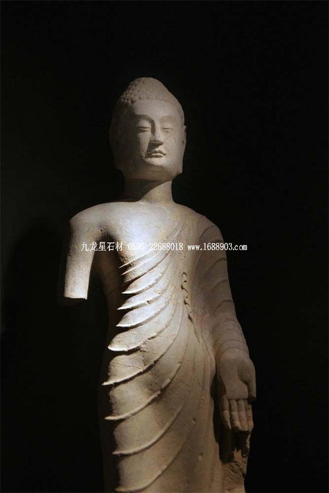 北魏、北齊時期,佛像雕刻藝術(shù)趨于巔峰極致之境界。北魏佛像造型挺拔秀美,細腰寬背,衣紋是富于裝飾的淺刻。北齊造像多為面型豐腴,衣紋簡潔,服薄貼體,整體平潤光潔,與面部寧靜安祥的表情和諧一致。這類疏簡淳潤的佛像造像,無論從光潔的肌體或平滑衣物里,似乎都能感覺到內(nèi)部筋肉的輕微變化。潤澤的體面與舒緩下垂的線條,使形象在疏簡平淡中流露出內(nèi)在的氣質(zhì)。