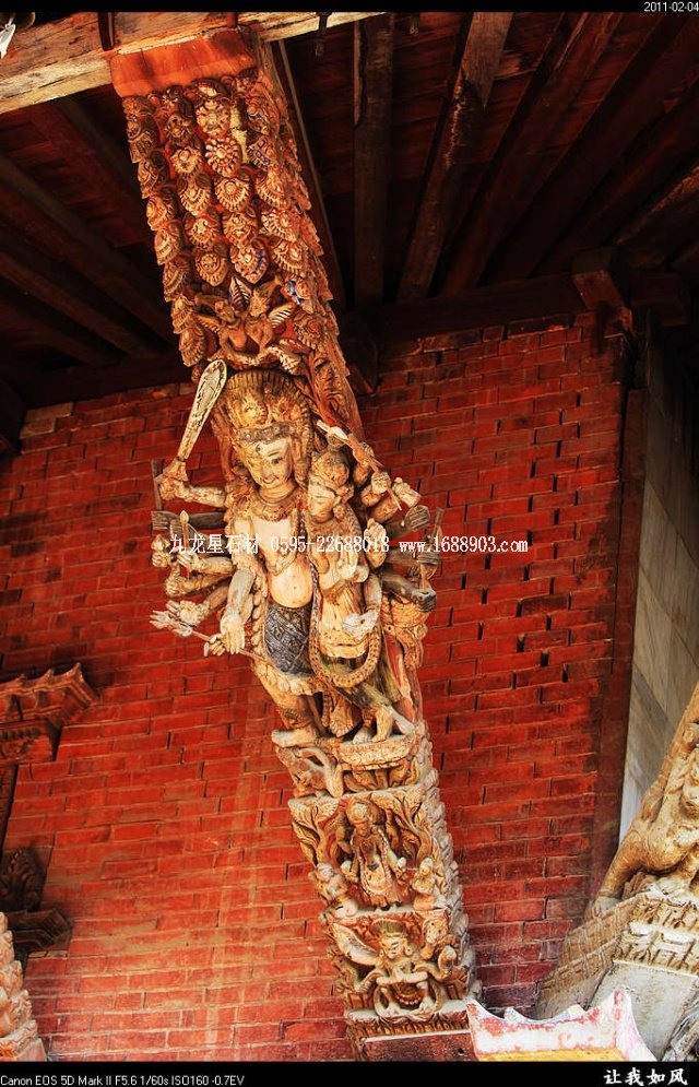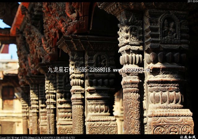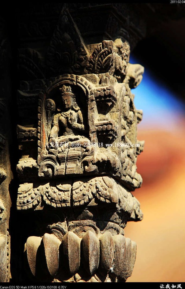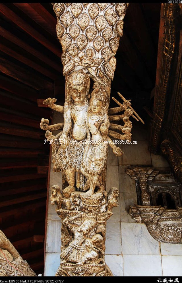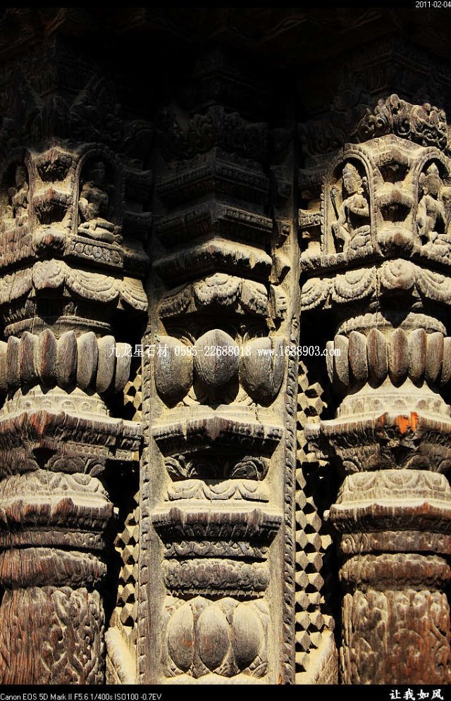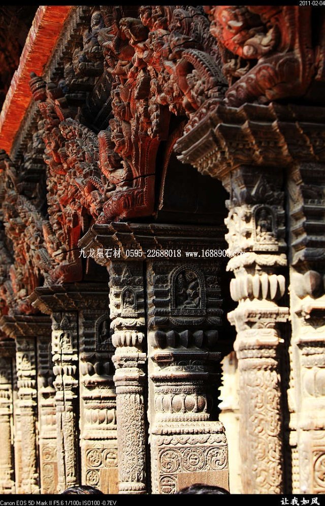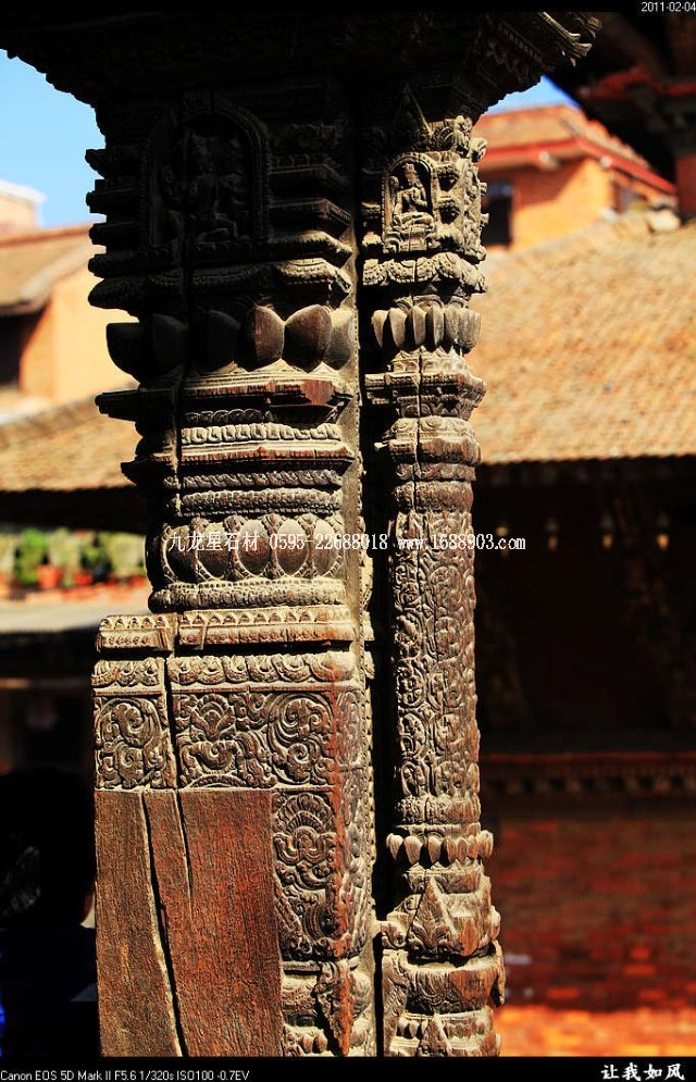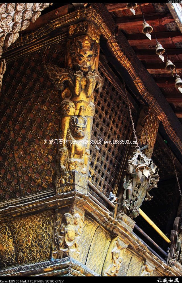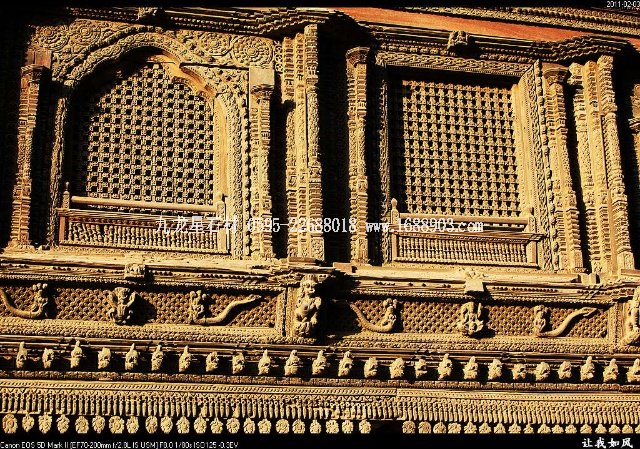 傳統(tǒng)的尼泊爾建筑,都使用雕刻木件,王宮和廟宇建筑自不必說(shuō),就是普通民居也是如此。使用雕刻木件處,主要是一些外露部分,如門(mén)、窗、廊柱、欄桿、屋頂及廊頂?shù)膿沃?。可以說(shuō),凡是外露的部分,有木件就有雕刻,而且都是人工雕刻。