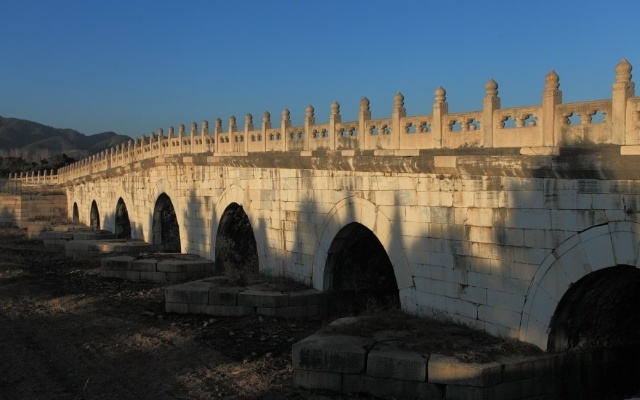 清代順治皇帝的孝陵里有一座七孔橋,它是陵區(qū)眾多橋梁中的佼佼者,橋孔最多,橋身最長,如玉虹垂落,雄偉壯觀。這是一座神奇別致的橋,特殊之處在橋欄板,乍一看與其他橋上潔白的玉欄沒啥兩樣,可用手輕輕一敲,則可發(fā)出金鐘銀鈴一般清脆悅耳的音響,使人大為驚異。這是因?yàn)闄诎迨现泻?0%的方解石,含有鐵質(zhì),所以才會(huì)有叮當(dāng)作響的妙音,如鐘如罄。建筑時(shí)根據(jù)每塊欄板含鐵量多少,按中國古代音律由宮、商、角、徵、羽五音組成,所以孝陵七孔石拱橋也稱為“五音橋”。