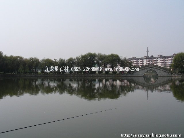 小橋綠樹垂竿倒影水中,景色麗人。