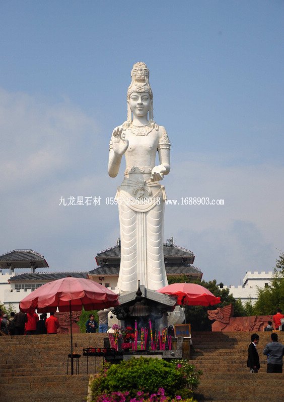 在云南福星廣場的正中矗立著一尊高達17.56米的漢白玉觀音雕像。該像共由269塊漢白玉構(gòu)成,重約400噸,具有“端莊、肅穆、神奇、美慧”等造型藝術(shù)特征。觀音像的兩臺基座(蓮花座和須彌座)分別高2米和1.2米,觀音像高14.36米,系目前世界上最高的一尊漢白玉觀音雕像。