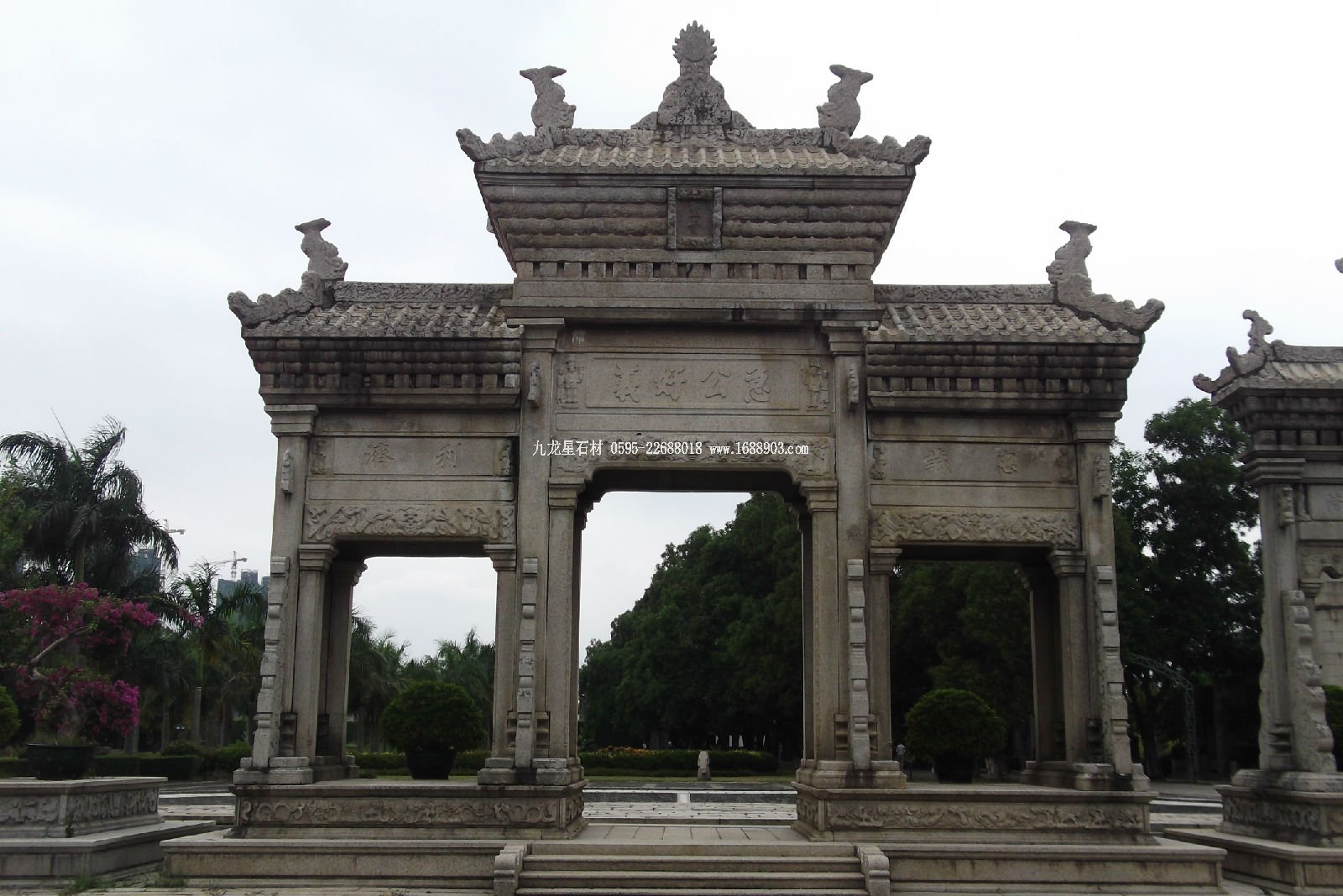 解放后因擴(kuò)建馬路需要移走,一建公司的師傅們連夜施工,整拆整蓋,原樣又建在了城南的陶然亭公園,多好的東西啊!‘文革’中楞把它說(shuō)成是“四舊”,下場(chǎng)是被砸爛、棄之。 寺院石雕山門 北京齊化門(今朝陽(yáng)門)外神路街口的琉璃牌樓是北京同類牌樓中最大的,那是老東岳廟的遺物,現(xiàn)在掛上了“文物保護(hù)’的牌子。整個(gè)北京城保存下來(lái)最大的石牌樓得數(shù)明十三陵的牌樓,是六柱五間十一樓,建于嘉靖十九年,至今有小五百年的光景啦。這牌樓高十四米多,長(zhǎng)有二十九米,梁朽、斗拱、屋頂都是仿木制結(jié)構(gòu)的形制雕刻成的。梁朽上雕刻出旋子點(diǎn)金彩畫(huà),從殘存的顏色還能隱約看出當(dāng)年石坊上曾經(jīng)有過(guò)美麗的彩繪。在石坊六根方柱石下是巨大的夾柱石(又叫袍柱石座),石上雕刻著巨龍、海獸、獅子、麒麟和云氣波濤,鬼斧神工的匠術(shù)令人贊嘆不已。 今天,古老的北京在保護(hù)和修葺古老牌樓的同時(shí),一些新的牌樓也拔地而起:王府飯店前面的牌樓,琉璃廠文化街的牌樓,紫玉飯店的牌樓,地壇公園西門外的牌樓,還有老北京微縮景園的牌樓……得,聊這么會(huì)子啦,今兒個(gè)就先到這兒,您抽功夫迢彎,看看這些個(gè)牌樓那不也是件有意思的事嗎?興許到時(shí)咱們還能碰上,到那時(shí)我沏上壺好茶再跟您慢慢聊吧!.