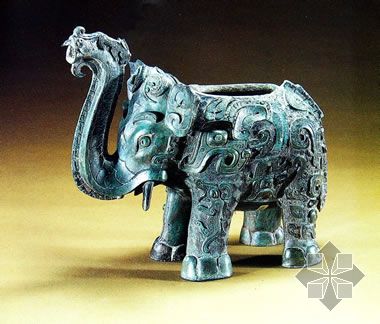 湖南醴陵出土的商代象尊,小象造型厚重,四足粗短,兩耳張開,長鼻高過頭部,鼻端內彎成有力度的起伏,與穩(wěn)穩(wěn)站定的四足形成動與靜的對應。象體布滿紋飾。在高揚的鼻端有一伏臥的小獸,窺視著象頭頂上的一對蟠蛇,使造型增添了生動、活潑的因素。伸縮自如的長鼻和笨拙的軀體,生動地表現(xiàn)了象的特點。相比之下,安陽殷墟婦好墓出土的玉雕,在人物的刻畫上則出現(xiàn)了夸張的表現(xiàn),具有神秘色彩。 商 湖南醴陵青銅象尊 高26.5厘米