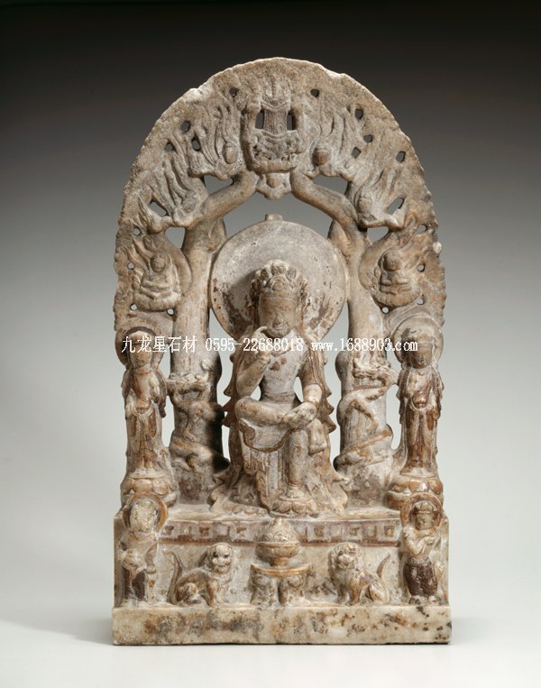 館藏思維彌勒像雖運(yùn)用成規(guī)的造像碑格式和構(gòu)圖,但設(shè)計(jì)制作別具一格。用鏤空技法雕出一庭園背景,為白色的大理石作品更增添了一種清新和輕盈的視覺效果。彌勒左腳踩蓮座,半跏趺坐于兩棵大樹之間。樹干有龍盤繞,兩樹枝葉相纏構(gòu)成圓拱形背屏,又有四飛天簇?fù)硪环剿谥醒?。這些細(xì)節(jié)是彌勒經(jīng)典形象的描繪,彌勒在龍華樹下成佛,方塔即釋迦牟尼的舍利塔。蓮座和方塔象征彌勒是釋迦佛的繼承人。彌勒臉形方圓,戴頭冠和瓔珞,軀干和四肢分明,肩臂圓潤(rùn),薄裙貼體。兩旁有脅侍菩薩,腹部前凸,一腿側(cè)立,膝蓋略彎,作稍息站勢(shì),開啟了后代菩薩形體造型的新風(fēng)尚。人物造型是漢化和受印度笈多佛雕(Gupta)風(fēng)格影響的產(chǎn)物。此尊造像是北齊時(shí)期題材和雕刻巧妙結(jié)合的典范。