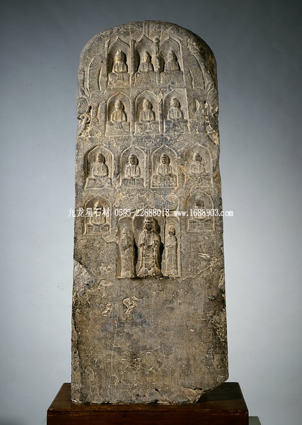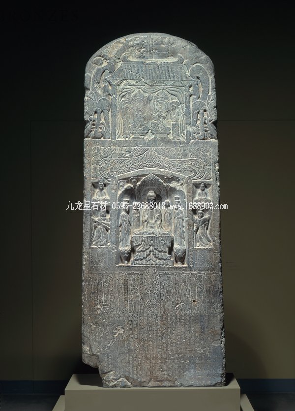 佛造像碑,西魏,公元549年,石灰?guī)r館藏的西魏石碑集兩種造像碑式樣于一體,即雙面數(shù)層佛龕式和千佛碑式。石碑正面是三段式構(gòu)圖。上段用減地陽(yáng)刻加陰刻的技法刻畫出維摩詰居士和文殊菩薩論法圖。人物刻畫秀骨清風(fēng),頗有魏晉名士風(fēng)流之韻。