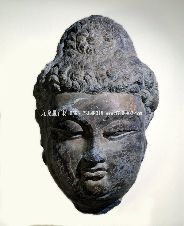 河南龍門石窟的擂鼓臺(tái)三洞建于武周和盛唐時(shí)期。館藏的佛頭像原屬其一洞窟中的大佛。佛有漩渦發(fā)型,高肉髻,臉龐圓潤(rùn)飽滿,眼呈俯視之態(tài),眼瞼微合,眼珠點(diǎn)黑彩,神態(tài)自信沉著。根據(jù)頭像的碩大尺寸可知原大佛應(yīng)高高在上。由此,若從仰視的角度再看這尊頭像,佛的容顏就變得更溫和親切,實(shí)可為原設(shè)計(jì)之本意。獨(dú)特的創(chuàng)意和純熟的雕刻技法,是盛唐造像得以具備高度寫實(shí)性和表現(xiàn)性的原因。