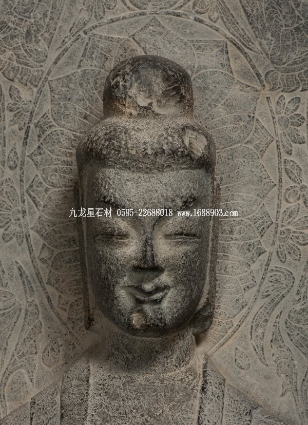 石碑正面雕一佛二菩薩,菩薩腳邊有護(hù)法獅子,現(xiàn)只剩殘?bào)w。佛和菩薩面相清瘦,身軀修長(zhǎng),頭部和手腳近似圓雕,佛裝則以高淺浮雕展示不同層次。如佛身上的漢化褒衣博帶式袈裟和衣裙腳部重疊衣褶的造型。他們身后是火焰形大背光,上面用減地陽(yáng)刻和陰刻手法由中心向外畫出五個(gè)裝飾圈。中心圈是佛的頭光,內(nèi)有蓮花瓣;旁圈里是過去七佛;再外圈有六身飛天環(huán)繞,上部有一人形神獸頂一香爐,飛天或持蓮苞、香熏和樂器,姿態(tài)飄逸清揚(yáng);在此圈的尖頭部分又畫出第四圈,內(nèi)含一佛像,禪定趺坐于蓮花寶座上,側(cè)脅兩個(gè)飛天;最外圈是飛動(dòng)的火焰圖案。