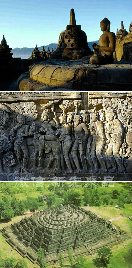 據(jù)說,婆羅浮屠是一座9世紀(jì)時期位于印度尼西亞中爪哇省馬格朗地的大乘佛教佛塔。實際上,此佛塔的實際存在時間比那個時間還要古老很多。這座塔共九層,上面三層是圓形,下面是六層方形,裝飾有2672塊浮雕和504尊羅摩居民的雕像。每面墻都上都有一個有關(guān)大佛出身的故事以及佛手的故事。主圓塔位于最頂層中心,其四周的里面坐著72個羅摩居民雕像的穿孔佛塔。