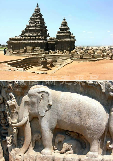 馬哈巴利普蘭岸上寺,8世紀(jì)初由帕拉瓦國王Rajasimha建于印度的馬哈巴利普蘭海灣。實際上由兩座背靠背的神殿組成,一座面向東方,較小的則面向西方。岸上寺屹立在孟加拉灣的邊緣。漲潮時,海浪會拍打寺體,墻壁即周邊的雕塑已經(jīng)歷經(jīng)了1300年的風(fēng)吹浪打,卻依舊安然無恙。