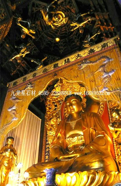 九龍殿:可以說是普陀山上龍文化的集大成之杰作。此殿在清康熙三十八年建成后,世稱“宏制巧構(gòu),甲于東南”,名聞天下。據(jù)史料記載,清康熙四年,普陀山曾遭荷蘭殖民主義者侵占和掠奪,法雨寺殿宇被毀。三十八年經(jīng)康熙恩準(zhǔn),將金陵故宮的琉璃瓦和舊殿九龍?jiān)寰疬w于此,故而此殿的來歷不同凡響。為目前國內(nèi)寺院建筑中規(guī)模最高的一座佛殿,亦是法雨寺的主殿。九龍殿的特點(diǎn),重檐黃瓦,宏偉深廣,殿頂內(nèi)槽九龍?jiān)寰?穹窿成拱形,一龍盤頂,八龍環(huán)繞八根垂柱懸空而下,昂首舞爪,搶抓居中懸掛的琉璃燈,形成九龍搶珠之勢。其造型之生動(dòng),工藝之精巧,堪稱普陀一絕。在九龍殿中還有48根柱磉,均為透雕蟠龍,隆鼻斜眼,張發(fā)伸爪,各呈異態(tài),更使九龍殿增添了龍文化的風(fēng)韻和色彩。 也許是九龍殿的名氣太大了,歷代名人或文人所寫的楹聯(lián)、匾額、詩詞頗多,亦可能是歷代名人的眾多作品,因此進(jìn)一步提高了九龍殿的知名度,或許兩者兼而有之。如新編的《普陀山志》的楹聯(lián)篇中寫九龍殿的就有七條,占法雨寺佛殿之首。其中有菲律賓華僑葉健民、施佩君合家敬獻(xiàn)的“天華降錦屏,九龍殿中騰光輝;法雨潤靈鷲,白華山上顯感應(yīng)”,此為代表作之一。清朝金土奎的詩《法雨寺》中亦有“九龍殿已偕山老,五門對(duì)海雄”等吟九龍殿的詩句等等,可見九龍殿影響之大。