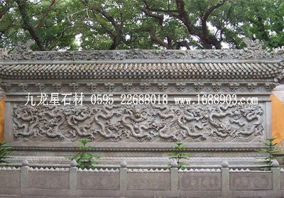 九龍壁:在法雨寺天王殿對(duì)面照墻處,1988年由溫嶺縣長嶼鎮(zhèn)民間石雕工匠梁宗濤等人用質(zhì)地優(yōu)良的青石板精雕細(xì)刻而成。它是仿照北京故宮九龍壁,卻又不同于故宮、大同等地的陶制九龍壁。法雨寺九龍壁是用60塊70厘米見方的優(yōu)質(zhì)青石,精雕細(xì)鑿,拼接而成。有的石板上是半個(gè)龍頭,有的石板上是一只龍角,有的石板上是一只龍爪,拼接起來竟然不露縫隙,像是在一塊青石上雕刻而成。這不僅有濃厚的刀味,石趣,更顯示了民間雕匠的高超工藝。此座九龍壁高2米,長12米,浮雕凸出16厘米。九條青龍騰飛于云山碧海之間,盤旋翻滾,爭奪龍珠,造型逼真,栩栩如生,富有立體感。而在梁與梁之間還雕有十七條造型各異的小龍,昂首舞爪,十分生動(dòng),更使這九龍壁群龍盤舞,似有龍將破壁,呼之欲出之感。此壁于1987年由香港同胞捐建。壁的東側(cè)還立有《新建九龍壁功德碑》,碑文曰:“法雨寺原有照壁,前有石牌檔,以條石和塊石為之。……因地狹樹大不相稱,始新建九龍壁,取龍?zhí)鞊碜o(hù)之說,且又與九龍殿相對(duì)稱,”云云。