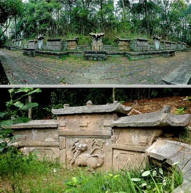 上圖:喬亭馮氏螃蟹形山墓群全景;下圖:祖墓馮伯達(dá)墓環(huán)墉上的麒麟浮雕該墓葬位于赤岸鎮(zhèn)喬亭村下西山螃蟹形山,墓向坐西北朝東南,共有墓葬11座。以祖墓馮伯達(dá)墓為核心,左昭右穆排列,符合傳統(tǒng)的禮制。墓前有供子孫祭奠的甬道、祭臺和三級拜臺,還有月池。每座墓前設(shè)石供桌一張,石供桌束腰和圭腳等部位淺浮雕盤長、方勝與如意云頭等紋飾。墓前立石碑,刻墓主身份、行號等,廡殿頂碑額,以一斗三升斗栱挑檐。左右兩側(cè)石欄板圍護(hù),有單鉤欄,也有重臺鉤欄,欄板上浮雕朱雀、麒麟、仙鹿、天馬等祥瑞圖案。墓包土封,設(shè)環(huán)墉。馮伯達(dá)墓屋環(huán)墉上高浮雕麒麟回首圖案,刀法蒼勁古樸,工藝精湛。