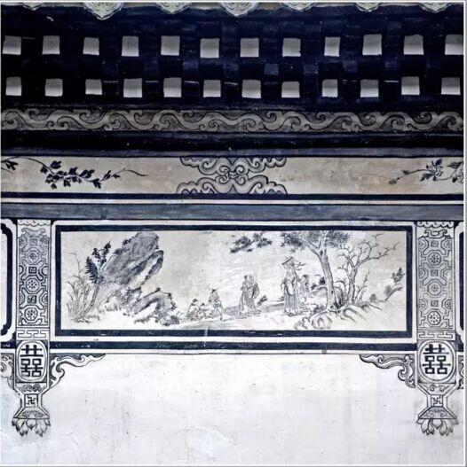 本譜壁畫位于經(jīng)畬堂照墻內(nèi)墻封檐下部位,以道教神話故事為題材,采用國畫手法,表現(xiàn)司祿星、壽星與正財(cái)神形象。整幅壁畫分為三段,上段用墨線勾畫(白描)連續(xù)的纏枝番蓮紋。中段白描如意云頭組合紋飾,以及纏枝花卉;下段用掛落柱式,分成若干仔屜,每個仔屜內(nèi)用國畫法繪山水人物。圖中僅表現(xiàn)一個仔屜,左側(cè)為山石雜樹,用筆勾畫,點(diǎn)苔,淺墨色暈染。人物采用白描畫法,司祿星居右,老壽星居中,財(cái)神趙公明居左,旁有仙僮。右側(cè)襯以松樹林柯圖。