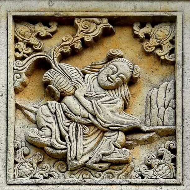 本譜石雕位于佛堂新屋里,取材于民間喜聞樂見的神話傳說。其原形相傳是唐代的萬回,象征家人和睦。宋代始作和合之神,主婚姻和合。圖中合仙捧圓盒,盒中吐納如意祥云紋。和仙手持荷花。兩位活潑可愛、頭梳元寶發(fā)髻、長發(fā)披肩的孩童,笑容滿面,十分惹人喜愛。人們借此來祝賀新婚夫婦白頭偕老,永結(jié)同心,家人相親相愛,家庭和睦。四個岔角上蝙蝠銜一枚銅錢,寓意福祿雙全。