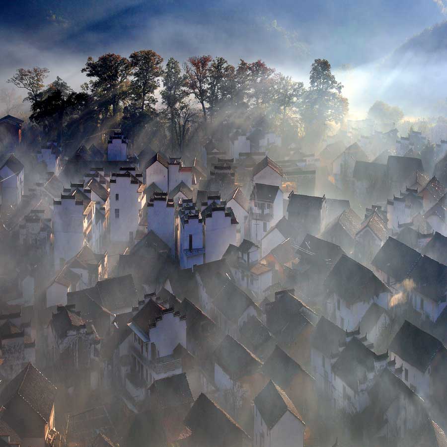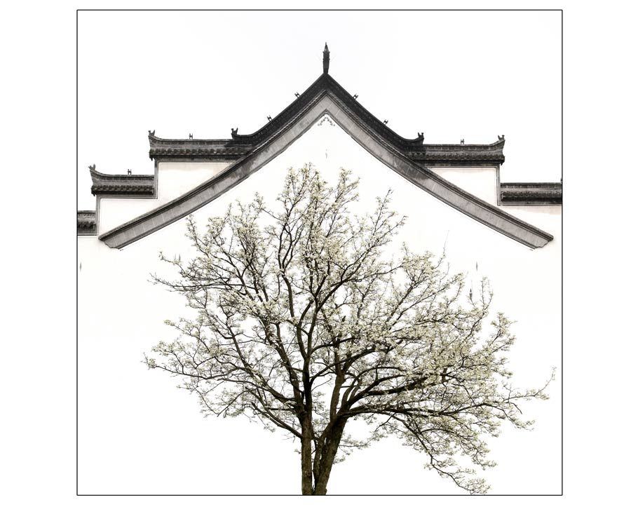 蔡龍---徽居。作品拍攝于皖南的一個山村,站在山坡上放眼望去,那一株株梨樹漫山遍野,白茫茫的一片,像起伏的波浪。在徽派建筑群的印襯下,展現(xiàn)眼前是一幅美麗的畫卷。