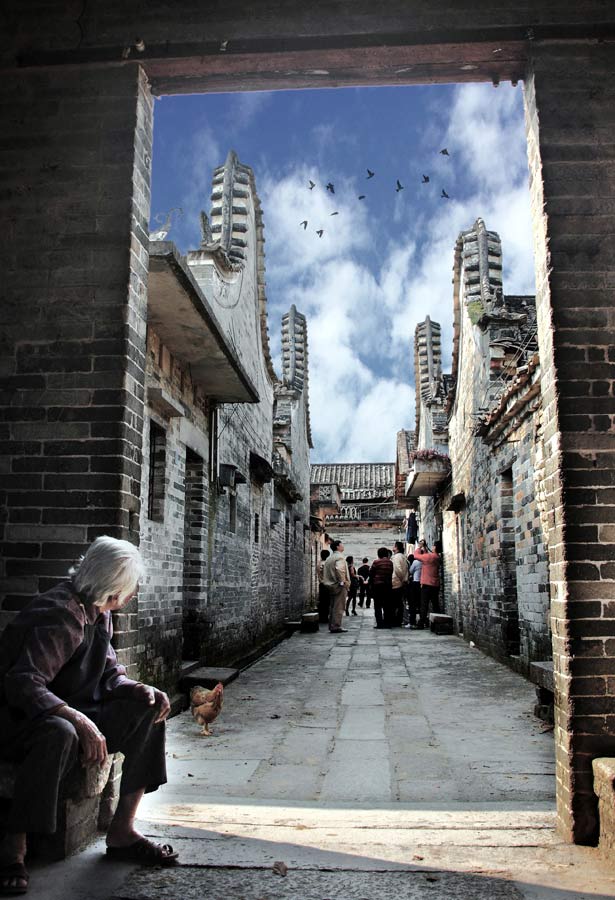 黃靈輝---古村來客。作品拍攝于2012年3月的一個下午,作者被高低起伏層層疊疊的鍋耳樓群的氣勢深深吸引和打動,這時剛好有一個白發(fā)蒼蒼的老阿婆坐在古村門樓內(nèi)的石板凳上,或許是感到稀奇,不停的回首張望著古村里的游客們。