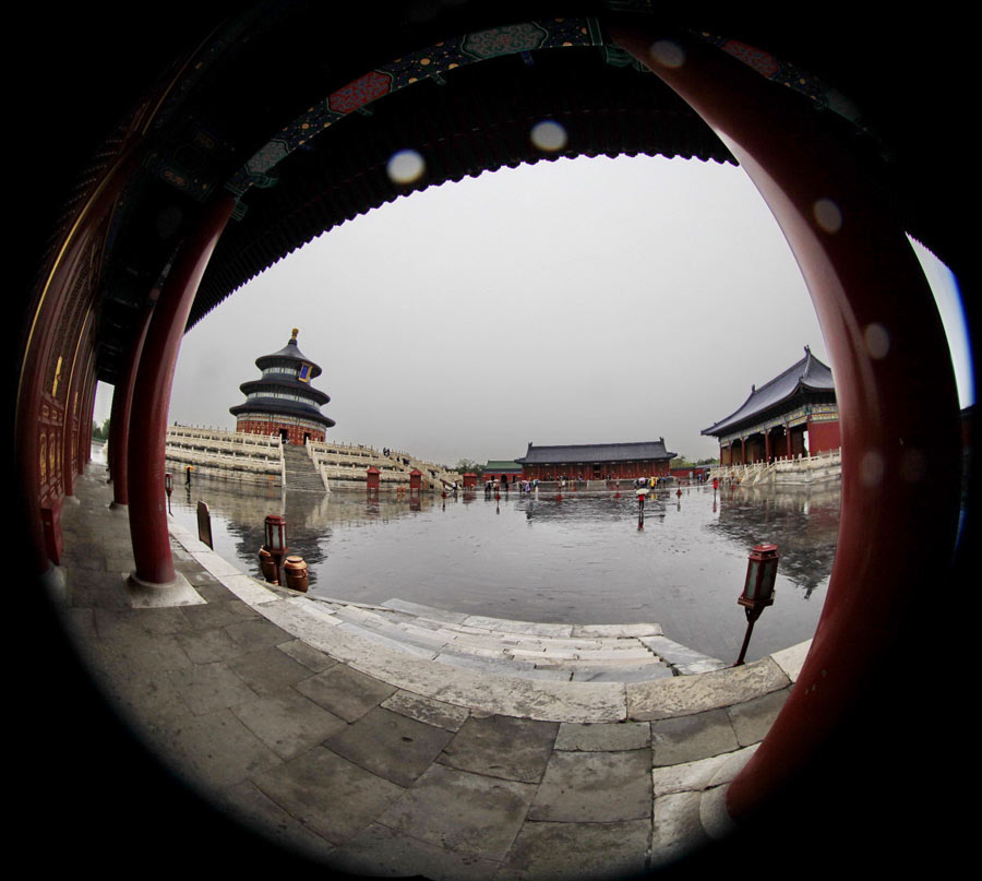 冀曉俐---天壇。天壇是著名的皇家園林,作者為表現(xiàn)它的宏偉氣勢呢,利用雨天地面的倒影增加它的韻律,再用屋檐下的柱子做框架,經(jīng)過魚眼鏡頭寬范的超角度的拍攝,把祈年殿收入其中。