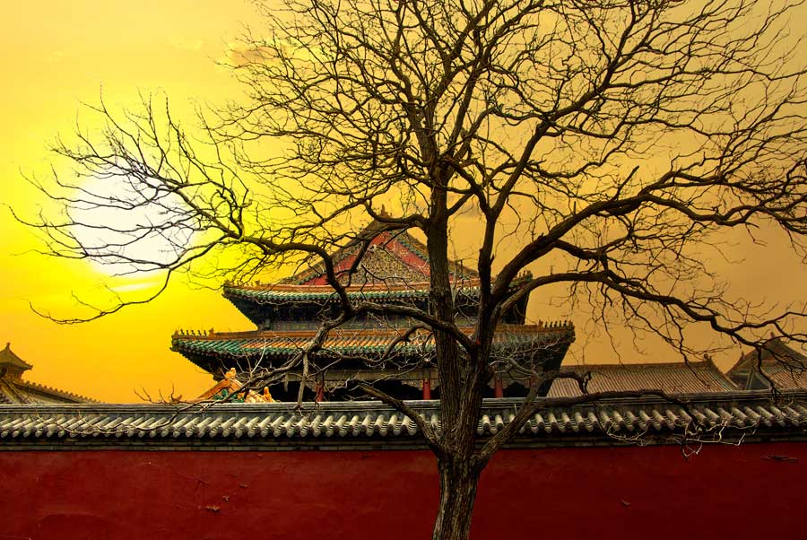 葉峰---故宮夕陽。作品展現(xiàn)了在殘陽的余輝,金光映照著孤獨宮殿下, 在枯萎的大樹影襯下讓人感慨一個帝國的消亡,中華文明博大精深。