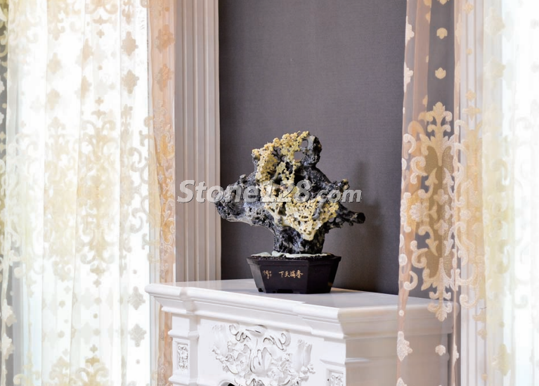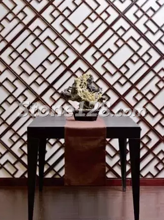 在新中式風(fēng)格的大廳中,石雕作品的外形與背景窗花的菱形相互協(xié)調(diào),取得了很好的諧調(diào)效果。石雕的色彩與整體環(huán)境的深色調(diào)相互統(tǒng)一,臘梅花典雅的黃色又活躍了色彩的意境氛圍。整體空間的直線風(fēng)格與石雕作品的曲線造型相對比,剛?cè)嵯酀?收放有度,取得了很好的視覺效果。