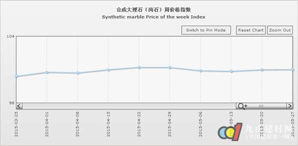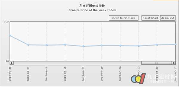 據(jù)“中國·水頭石材指數(shù)”系統(tǒng)監(jiān)測,20150527期石材周價格指數(shù)收報于98.71點,環(huán)比略上浮0.08點,上浮約0.08%。本周石材價格指數(shù)延續(xù)上周穩(wěn)中微升的趨勢、繼續(xù)微幅推升,其中其他石材類價格環(huán)比持平外,大理石、花崗石、合成大理石類價格均有所回升。大部分品類價格變化仍較穩(wěn)定,部分品種價格因市場需求有所增加及板面質(zhì)量差異小幅上揚。